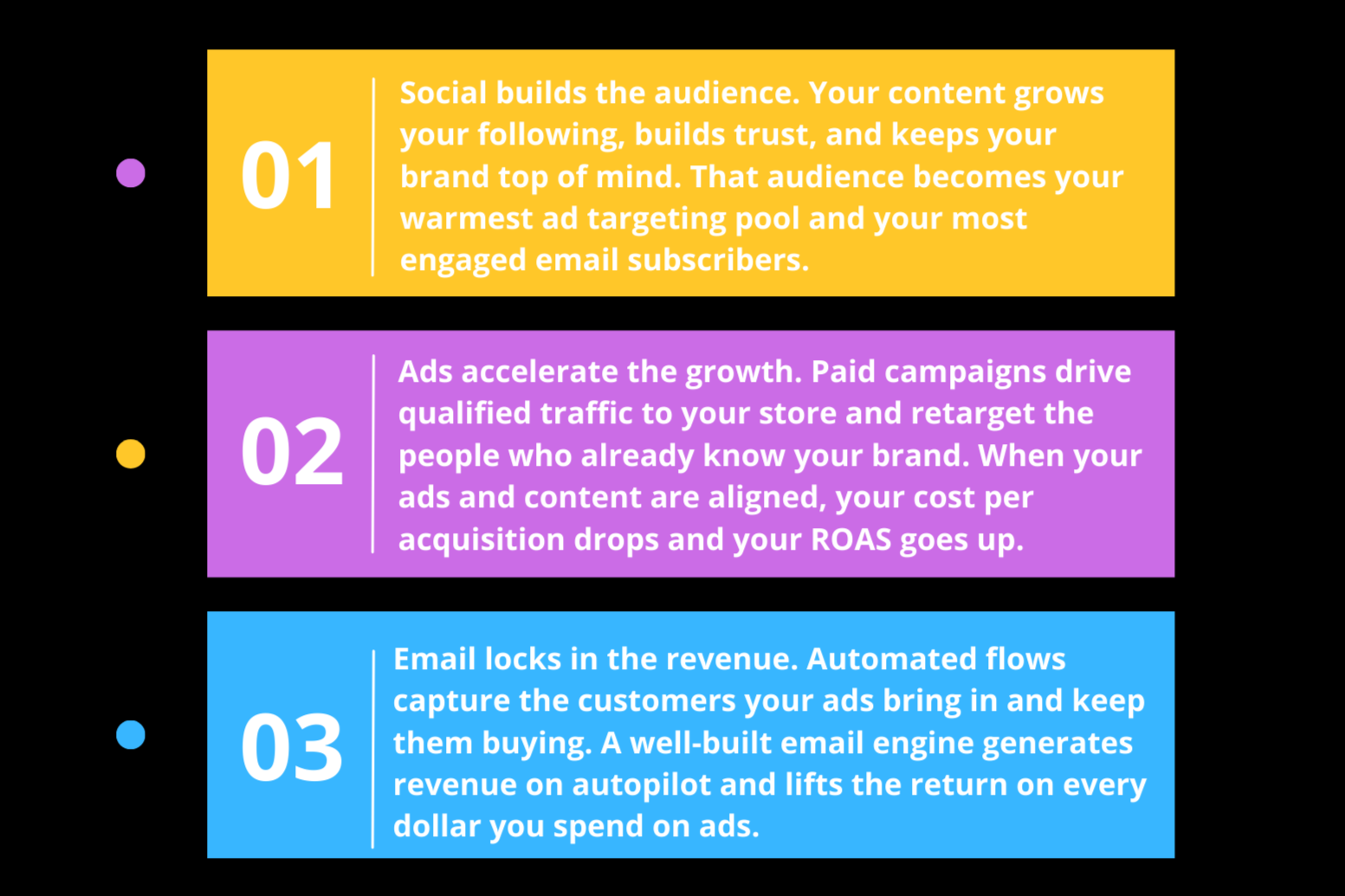 We operate as a hybrid team of specialists, each expert working within their specific field. Your social content is handled by someone who lives and breathes content creation. Your paid ads are managed by someone who runs campaigns every single day. Your email flows are built by someone who knows e-commerce automations inside out. And it's all coordinated under one strategy, built for your brand.